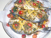 Ingrédients : Un gros poisson évidé 1 c. à café de cumin 1 c. à café de coriandre en poudre 1 c. à café paprika 1 c. à café de poivre de Cayenne 3 gousses d’ail 4 c. à soupe de persil haché 4 c. à soupe d’huile Jus ...